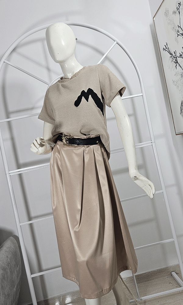 Falda color kamel midi, pliegues en delantero y encauchada en la cintura en la parte de la espalda